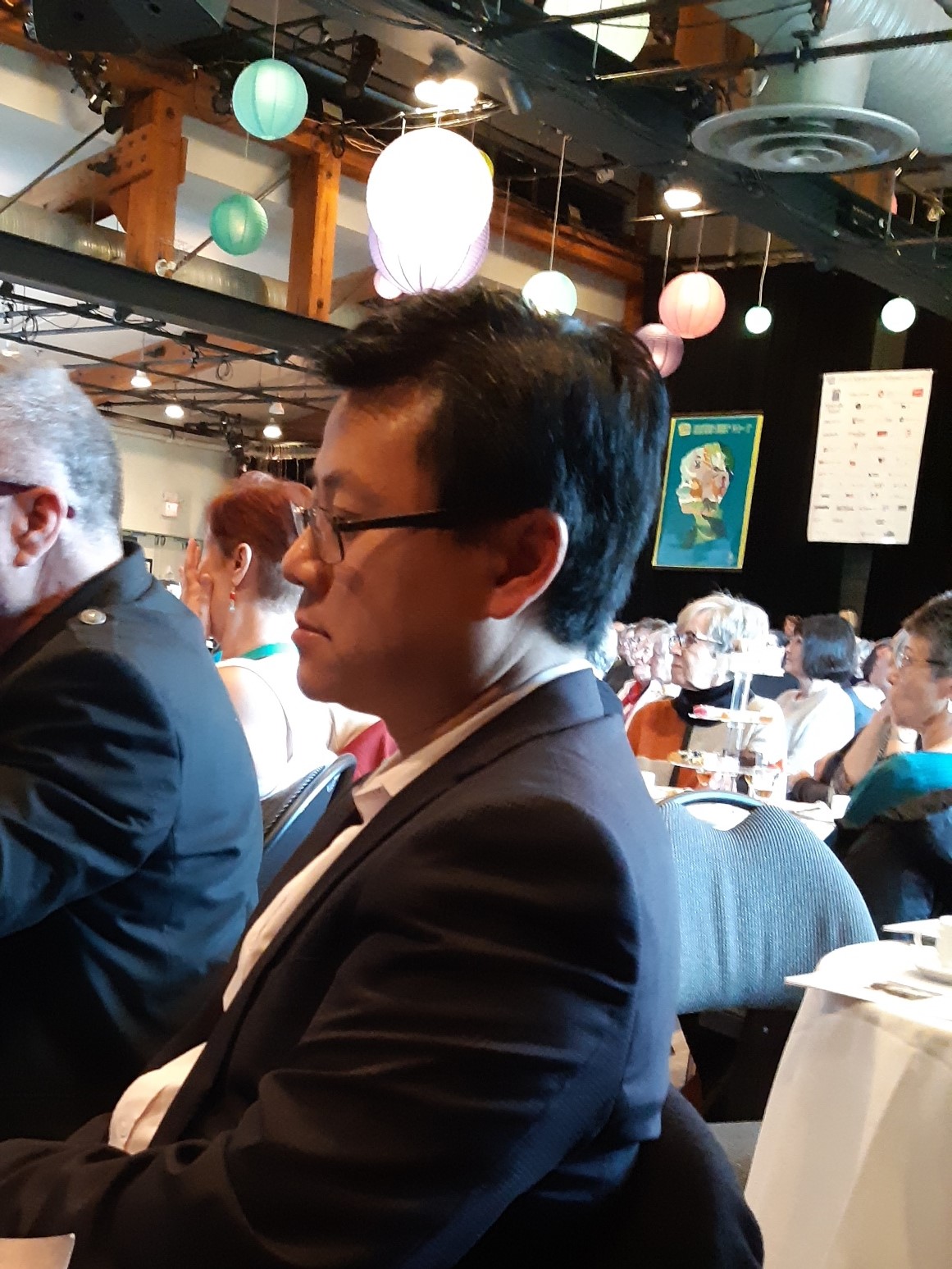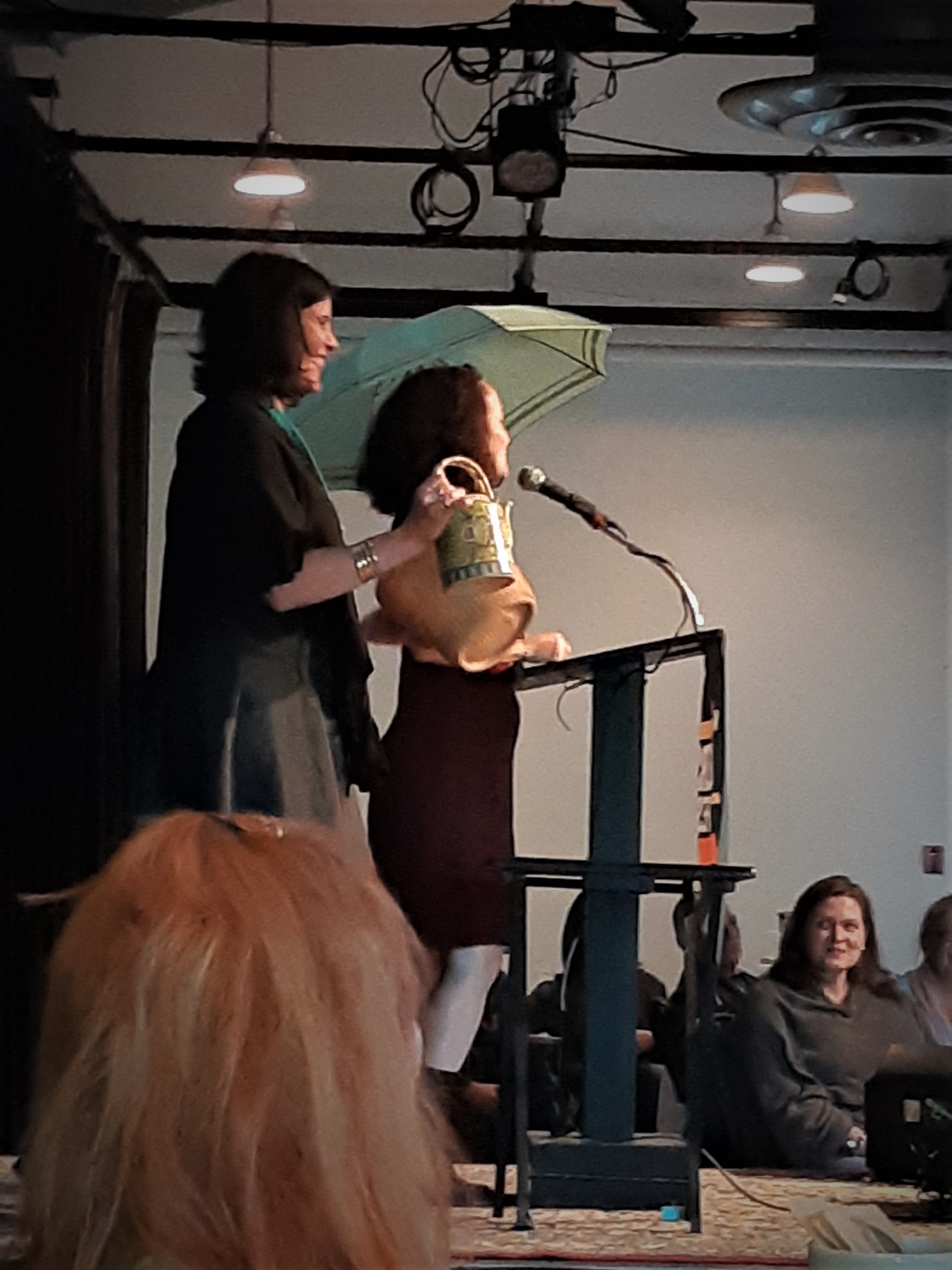 An inspiring and amazing afternoon with host Amber Dawn and fellow readers Marina Endicott, Cherie Dimaline, Philip Huynh, Bill Richardson and Armando Lucas Correa. Photo on left is of VWF’s Leslie Hurtig and Nicole Nozick auctioning off Timothy Finlay’s umbrella and teapot to benefit youth involvement in the Festival.